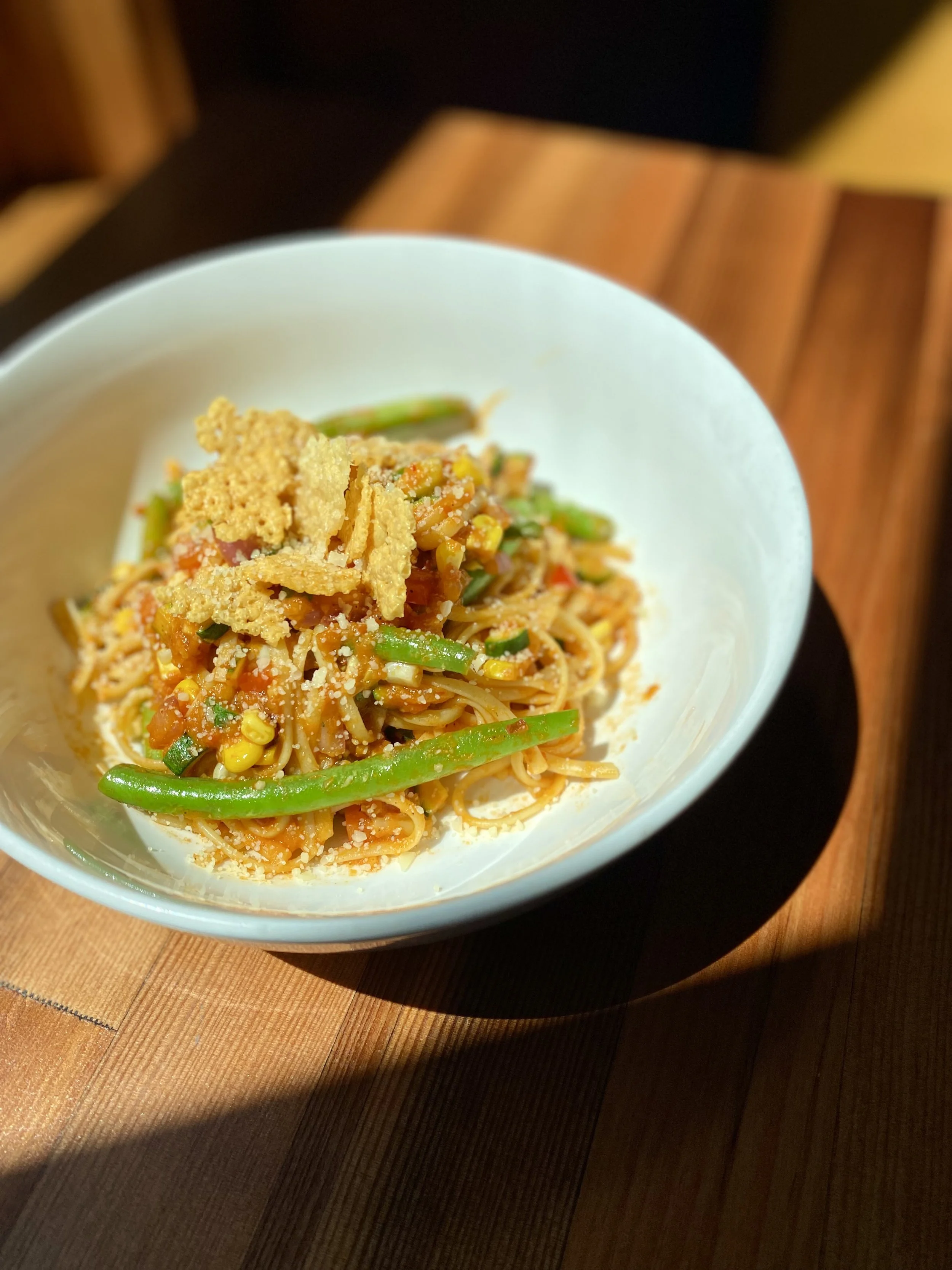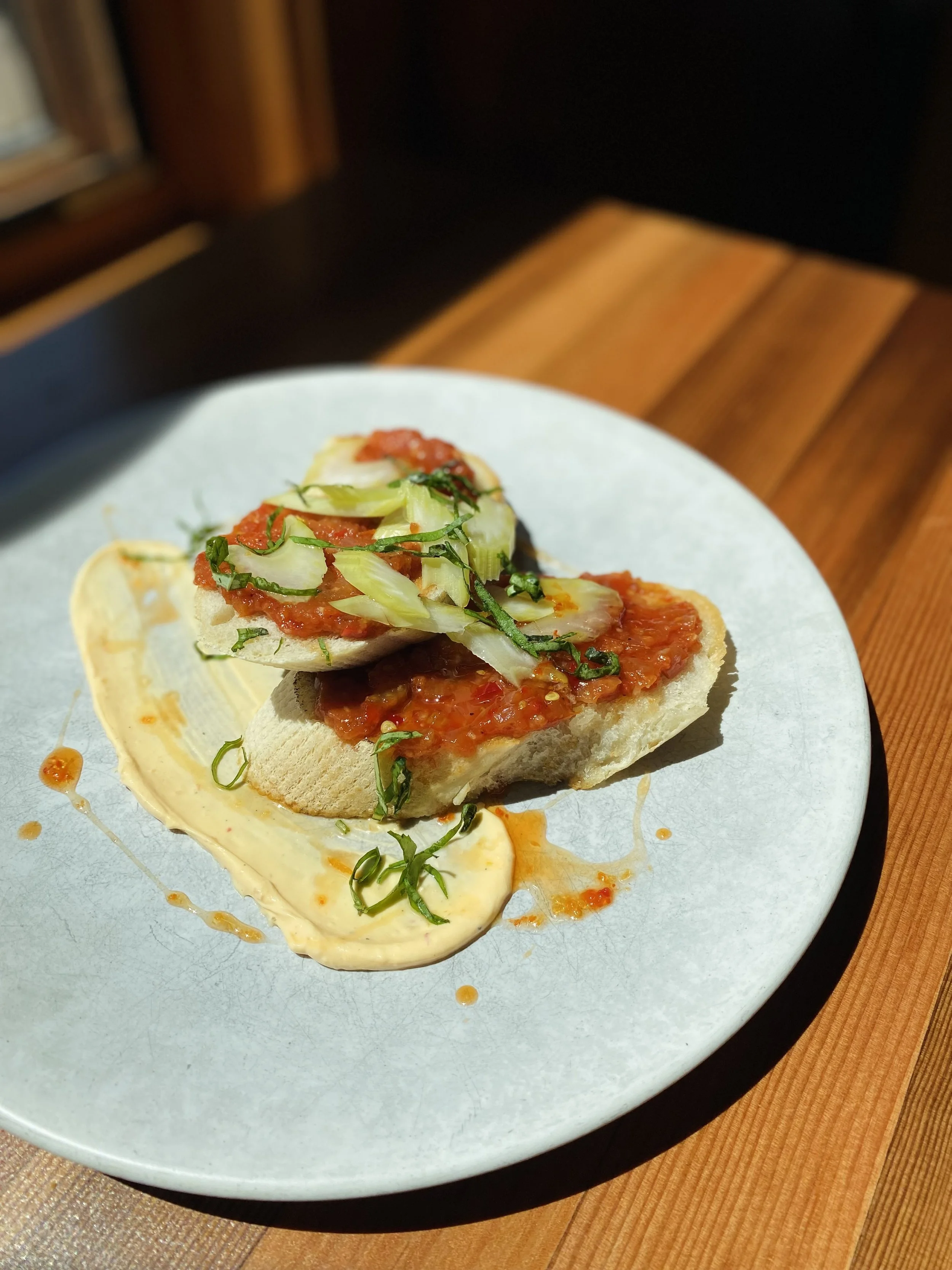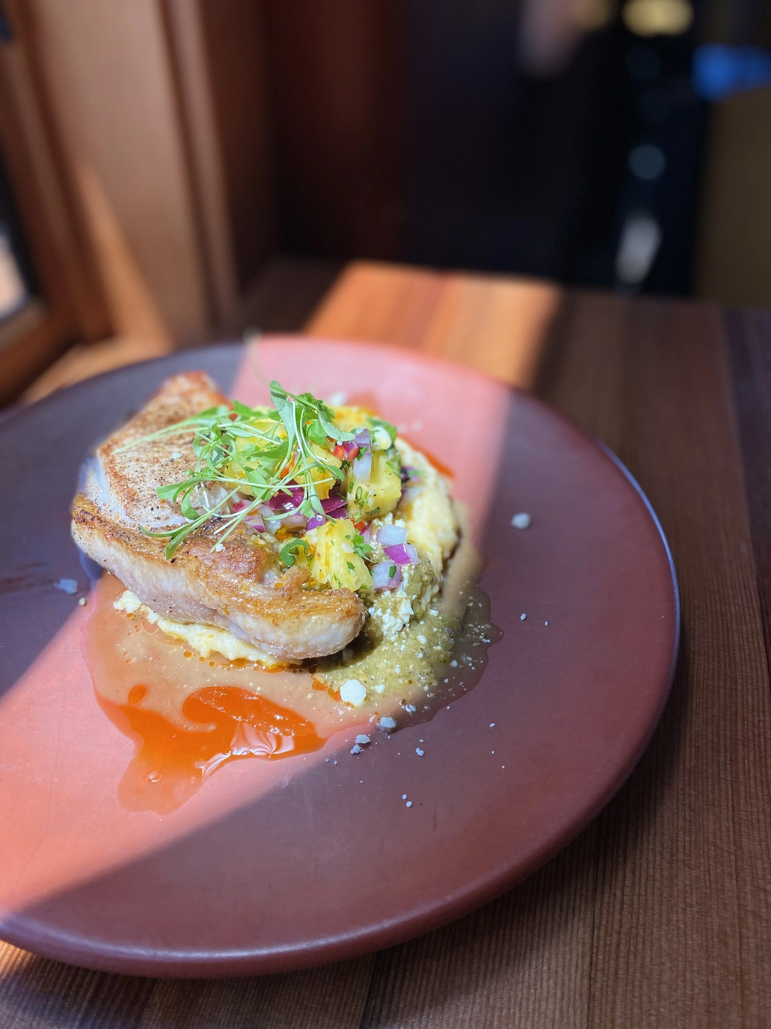 Lunch & Dinner Starters Bruschetta Veg 15 Sourdough, tomato jam, sambal honey goat cheese, pickled celery, basil, sambal honey drizzle Pork or Tofu Lettuce Wrap GF 17 Pork/tofu, kimchi, bulgogi, sesame, cilantro, scallion oil Zucchini Hummus Vegan 15 Zucchini hummus, tapenade, sumac pepita, radish sprout, olive oil, pita Shrimp DF 18 Shrimp skewers, Cajun aioli, pickled fresno, shrimp oil, rice cake Ceviche 18 Red snapper, coconut milk, lime, pickled fresno/red onion, blue corn chips Soups & Salads Cup $6 | Bowl $9 Soup of the Day Cup $6 | Bowl $9 Side Salad Vegan 9 spring mix, cucumber, red onion, tomato, carrot, radish, crouton Warm Broccoli Veg/GF 16 Broccoli, native wild rice, shallot, green onion, arugula, miso vinaigrette, sesame seed Strawberry GF/vegan 15 Spring mix, arugula, strawberry, pecan, poppyseed vinaigrette Caesar 14 Romaine, roast fennel, parmesan, crouton, chive Add protein to any dish Burger 8 Snapper 14 Salmon 15 Shrimp 11 Hotdog 5 Steak 24 Tofu 5 Crispy Chicken 6 Local White Fish 11 Entrées Salmon GF 31 Wild rice pilaf, broccoli, radish chimichurri, kale, chili oil Steak GF 53 Zabuton, demi, fingerlings, asparagus, miso blue cheese, roast roma tomato, pickled fresno/red onion, scallion oil Red Snapper GF 28 Brown butter white bean puree, succotash, kale pesto, roasted Roma tomato , chili oil, pickled red onion Pork Chop GF 32 Polenta, black beans, tomatillo poblano sauce, pineapple salsa, asparagus, cotija cheese, Cajun popcorn, cilantro Beef Tagliatelle 26 Braised beef, goat cheese, demi-glace, parmesan, butter, pickled red onion, radish sprout, focaccia Pork or Tofu Masala Vegan with Tofu 24 Coconut jasmine rice, masala sauce, zucchini, broccoli, pickled fresno/red onion, cilantro, chili oil, sesame seed, focaccia Calabrian Chili Pasta Veg 18 Linguini, Calabrian tomato sauce, green beans, zucchini, corn, red pepper, red onion, arugula, lemon, parmesan, focaccia Shrimp Pad Thai GF 28 Rice noodle, broccoli, red pepper, red onion, lime, peanut, scallion Smoked Cheddar Mac and Cheese Veg 20 Smoked cheddar/muenster blend, toasted bread crumbs, grilled focaccia Add Yker hotdog 5, bacon 3, pickled chilis 3, mushrooms 3 Puttanesca Veg 21 Rigatoni, San Marzano puttanesca sauce, basil, capers, olive tapenade, zucchini, asparagus, corn, shallot, focaccia Sandwiches choice of fries, fruit, or coleslaw | sub gluten free bread +2 Lake Avenue Burger 21 Housemade brioche bun, smoked cheddar/muenster blend, L.A. pickles LTO available by request add bacon - 3 Whitefish Sandwich 23 Lake superior white fish, Baguette, curried tartar sauce, slaw Tofu Sandwich Vegan 18 Focaccia, bulgogi marinated tofu, kimchi, pickled carrot, cilantro Pork Belly 19 Brioche, pork belly, date jam, sambal honey goat cheese, pickled fresno, arugula Whitefish Tacos 18 Lake superior white fish, pineapple salsa, cilantro, blue corn chips Kids Menu Lunch & Dinner Served all day Grilled Cheese - 9 Sourdough, cheese blend, Choice of side: french fries, fruit, or colestaw Cheeseburger - 13 Housemade bun, cheese blend, Choice of side: french fries, fruit, or coleslaw Pasta - 10 Mac & Cheese or Alfredo Sauce with parmesan Chicken Strips - 11 Choice of side: french fries, fruit, or coleslaw Veggie Cup - 6 Raw mixed vegetables with choice of dressing: ranch, bleu cheese, vinaigrette Kids Drink - 3 Juice: apple, orange, cranberry, grapefruit; lemonade, milk, soda GF = Gluten Free | DF = Dairy Free | VEG = Vegetarian | Vegan * Some items are served raw or undercooked, or contain (or may contain) raw or undercooked ingredients. Consuming raw and undercooked meats, poultry, seafood, shellfish, or eggs may increase your risk of food-borne illness.